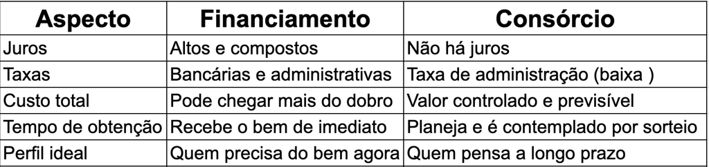 O comparativo deixa claro: o financiamento compra o tempo. O consórcio constrói o futuro.